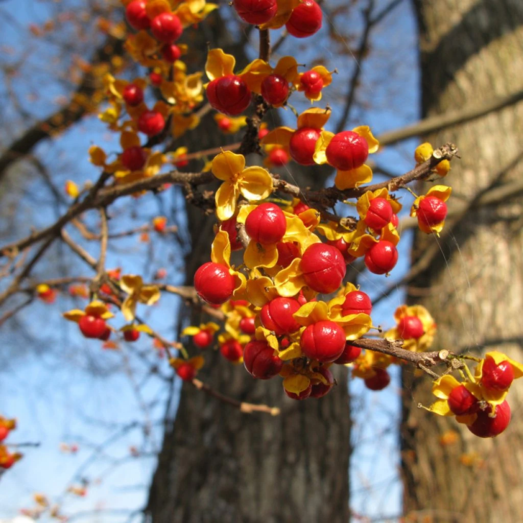 Le Celastrus orbiculatus Diana est un vigoureux arbuste grimpant, aux tiges volubiles, dont la gĂ©nĂ©reuse fructification reste dĂ©corative depuis la fin de l’étĂ© jusque tard en saison. Ces fruits sont rĂ©unis en petites grappes bicolores, les capsules jaunes s’ouvrant sur une perle rouge-orangĂ©. Ces jolis fruits vous assureront la visite des oiseaux qui en raffolent, mais ne les imitez pas, la graine est toxique. Le feuillage, caduc, prend une belle teinte jaune en automne. ‘Diana’ est un bourreau des arbres femelle qui nĂ©cessite la prĂ©sence d’un cultivar mâle pour fructifier.